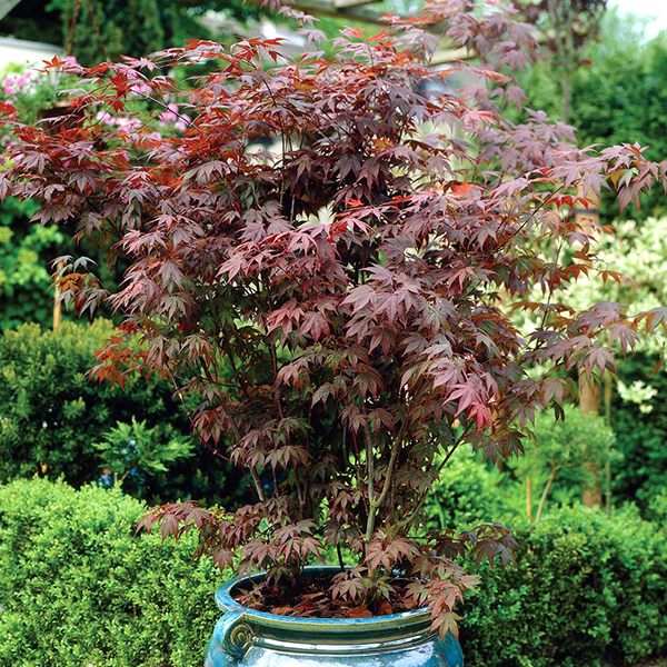 Клён пальмовый Atropurpureum - Acer palmatum Atropurpureum Крупный кустарник или небольшое дерево. Высота с возрастом может достигать 4 м, однако массу растение набирает относительно медленно. В зависимости от формовки крона может быть многоствольной и раскидистой. Листва не крупная 5-9 см, пальчато-лопастная, в начале сезона ярко-красная, в конце пурпурно-бордовая. Корневая система поверхностная с большим количеством тонких корней. На солнечных, сухих местах корни необходимо мульчировать. Предпочитает слегка кислые, суглинистые, песчаные, богатые гумусом субстраты. Плохо растет на тяжелых или уплотненных почвах. Важно выбрать для растения защищённое от холодных зимних ветров место. В молодом возрасте желательно укрытие на зиму. Возможно выращивание в контейнере с уборкой на зимнее время в прохладно, непромерзаемое помещение.