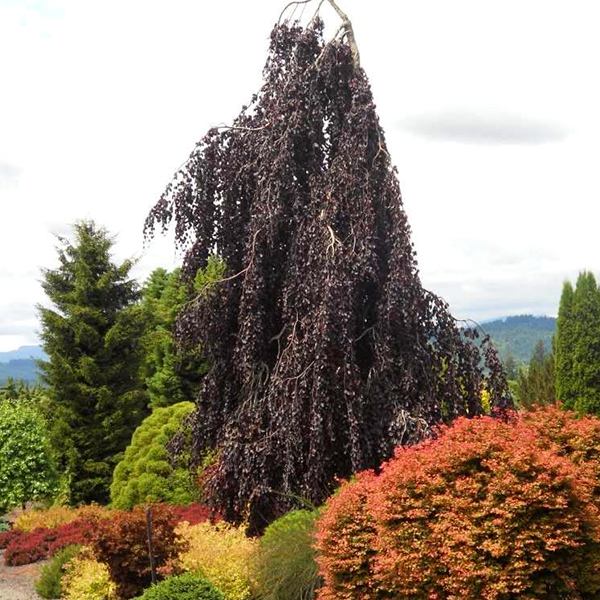 Бук лесной Purple Fountain - Fagus sylvatica Purple Fountain.  Исключительно живописное дерево с узкой кроной, повислой верхушкой и плакучими ветвями. Прекрасно смотрится среди больших камней, в восточных садах и возле прудов. Идеально подходит для создания ярких цветовых акцентов.  Относитьельно медленно набирает массу. В 10 – ти летнем возрасте высота обычно 2,0-2,5 м, а ширина 0,8-1,0 м. Боковые ветви свисают до земли. Листья вначале тёмно-красные, затем красновато-коричневые, яйцевидные, блестящие, распускаются в мае, осенью желтеют. Хорошо растёт на плодородных известковых умеренно влажных почвах и солнечных местах. Требовательно к влажности воздуха. Не переносит засуху и переувлажнение. Морозостойкость до -28ºС.