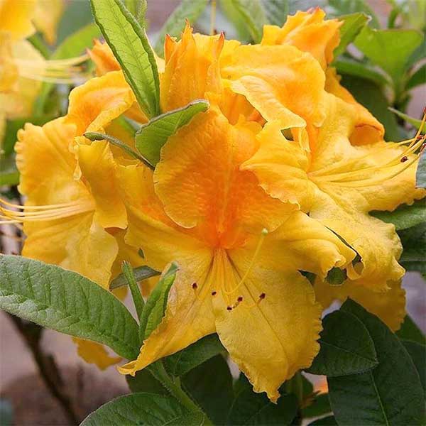 Азалия GOLDPRACHT - Azalia GOLDPRACHT  Сорт выведен немецким селекционером H. Hachmann в 1987 г. Листопадный, среднерослый, плотный кустарник с широкой и густой кроной. В возрасте 10 лет высота куста достигает 100 см, а диаметр -130 см. Листва осенью краснеет. Цветки яркие, медово-желтые, крупные (6,5 - 7,5 см в диаметре), с четким оранжевым пятном на верхнем лепестке, собраны в эффектные соцветия по 7-9 штук. Цветение обильное.  Цветет в конце мая-средине июня. Сорт имеет золотые награды на выставках  1989 BUGA Frankfurt и 2003 IGA Rostock. Морозоустойчив в условиях Беларуси.