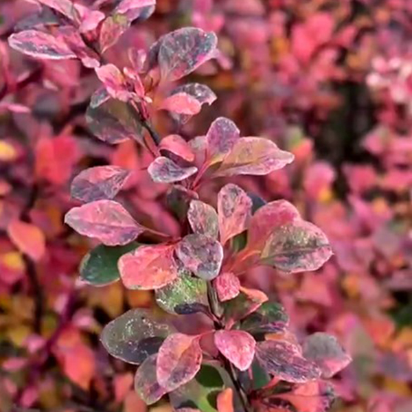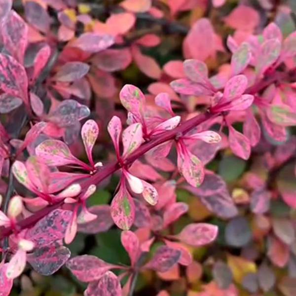 Барбарис тунберга 'Наташа' Berberis thunbergii 'Natasza' - Барбарис тунберга . Высота взрослого растения до 1 м, диаметр кроны 0,6-0,9 м. Крона раскидистая. Молодые побеги розовые или розово-светло-коричневые; взрослые - насыщенно-коричневые. Листья небольшие яйцевидные, пестрые розово-бело-зеленые, очень привлекательные . Соотношение розового, белого и зелёного цвета в окраске листа меняется в течении лета. На фото один и тот же куст в разные дни. Нарядная окраска листьев сохраняется на протяжении всего вегетативного сезона. Цветет растение в мае - июне. Цветки мелкие, лепестки цветков бело-кремовые, пыльники на тычинках желтые. Плоды - продолговатые , длиной до 1 см , красные, блестящие, созревают в конце августа - сентябре и потом еще долго держатся на побегах. Плоды не ядовиты, но в пищу обычно не используются. Морозостойкость до -35 °С.