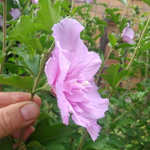 Гибискус сирийский Lavender Chiffon - Hibiscus syriacus Lavender Chiffon. Сорт профессора Кембриджского университета Родорика Вудса. Это неприхотливый, листопадный красивоцветущий кустарник, высотой до 1,5-2 м. Цветки неопределённого цвета сиренево – розовато - лиловые, около 10-12 см в диаметре, полумахровые. Кустарник цветёт обильно. Цветы у него одиночные, каждый отдельный цветок живет сутки, одновременно распускаются десятки цветков. Многочисленные бутоны, в пазухах почти что всех листьев, распускаются один за другим с июля до сентября. Для пышного цветения рекомендуется подкармливать растение фосфорсодержащими удобрениями. Желательно защищённое, солнечное место на плодородной, водопроницаемой почве и регулярный умеренный полив. Гибискусы сирийские цветут на побегах текущего года. Для того, чтобы не оголялся низ кустарника и он был плотным и компактным необходимо весной укорачивать прошлогодние приросты на 2/3. Морозостойкость до -25° С.