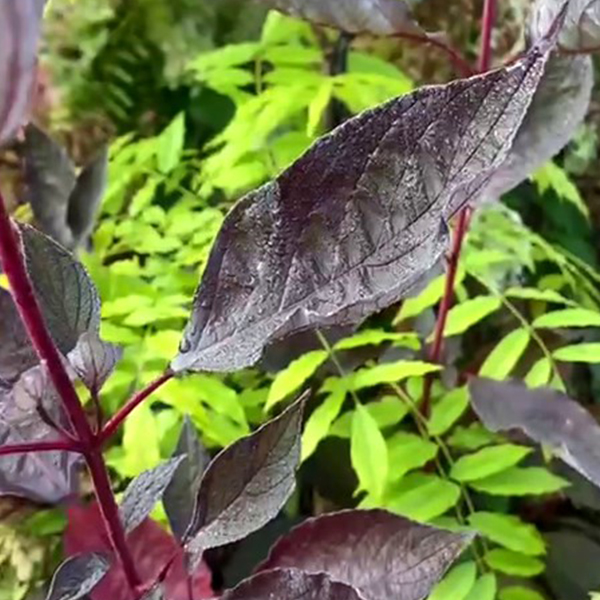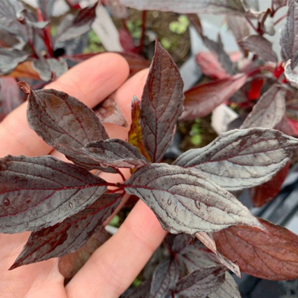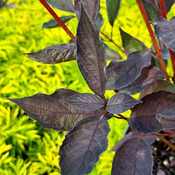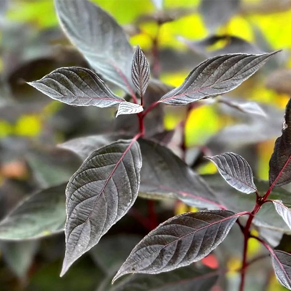 Дерен белый Nightfall (Сумерки). Cornus alba Nightfall. Новый сорт белого дерена с необычным для дерна листьями фиолетового цвета. Отличается более вертикальным ростом, чем другие сорта белого дерена. Весной его листья темно-зеленые, в течение сезона темнеют до глубоко фиолетовой окраски. Листья с нижней стороны имеют серую бархатистую дымку, которая красиво контрастирует с темным растением. Красные ветки зимой делают Cornus Nightfall привлекательным не только в вегетационный период, но и в холодное время года.