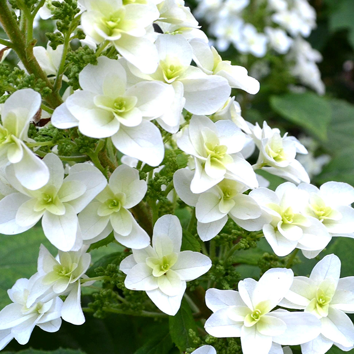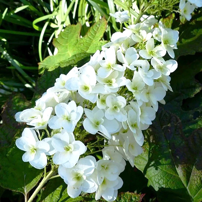 Дуболистная гортензия ‘Snowflake’ (Снежинка) - Hydrangea quercifolia‘Snowflake’ - это невысокий (около 1,2 м в высоту) листопадный кустарник с правильной, округлой кроной, цветущий крупными гроздьями цветов на жёстких стеблях и с необычными крупными, словно бархатными листьями, напоминающими своей формой листву дуба (quercifolia в переводе с латыни означает "дубовый лист"). Цветёт обычно в июле - августе. Цветки диаметром до 3,5 см, махровые, собраны в соцветия длиной до 25 см, отцветая немного розовеют. Осенняя листва, при условии, что растение находиться на освещённом участке, становиться легко бордовой.