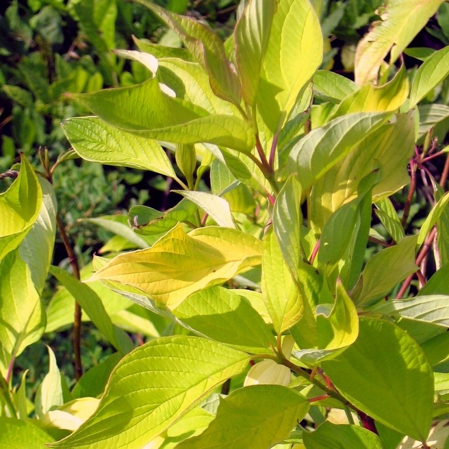 Дёрен белый Aurea - Cornus alba Aurea. Крупный, раскидистый кустарник с декоративными листьями и побегами. Крона шаровидная до 2,5 м в диаметре. Листья в течении всей вегетации имеют цвет всех оттенков жёлтого, со второй половины лета листва немного зеленеет и становиться светло-жёлто-салатовой. Очень зимостоек. Не требователен к почве. Эффектны красно – бордовые побеги, особенно яркие в зимнее время.