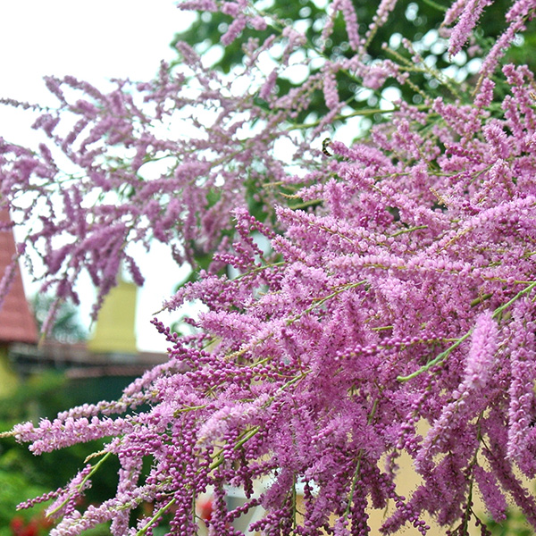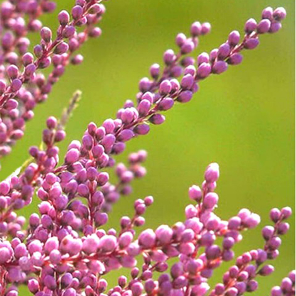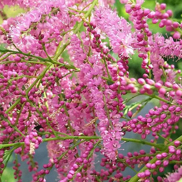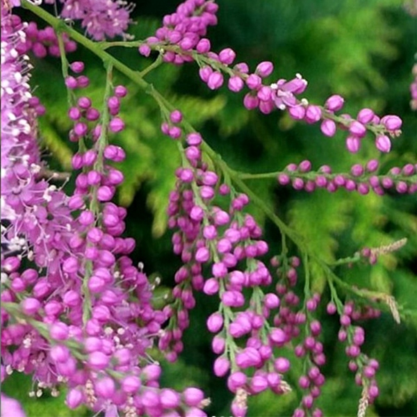 Тамарикс Pink Cascade - Tamarix ramosissima Pink Cascade. Пряморастущий кустарник, высотой 2-3 м. Крона ажурная, раскидистая. Миниатюрные чешуевидные листики в виде хвои с сизым налётом листьями, длиной до 1,5 мм. Миллионы мелких цветков собраны в длинные густые кисти, длиной до 40 см. Цветки ярко – розового цвета. Цветет очень обильно в июле - сентябре. Морозостойкость до -34 °C.