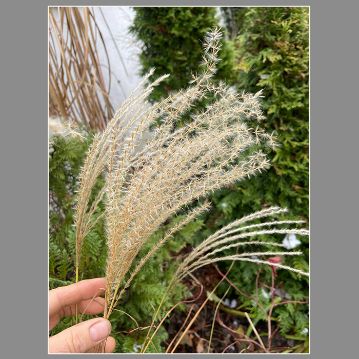 Мискантус китайский Якушима Дварф Miscanthus sinensis Yakushima Dwarf – это многолетний декоративный злак, один из карликовых сортов Мискантуса. Узкие, грациозно сгибающиеся вниз листья образует компактную, плотную кочку у основания не более 40 см , высотой около 50 см. Листья зеленые, с белой прожилкой по центру, осенью сначала набирают сине –фиолетовых оттенков, позже окрашиваются в оранжево-желтый цвет. Побеги растения прямостоячие. Колос достигает высоты около 1,2 м. Соцветия метельчатые, пушистые, окрашены в кремово-белый цвет.