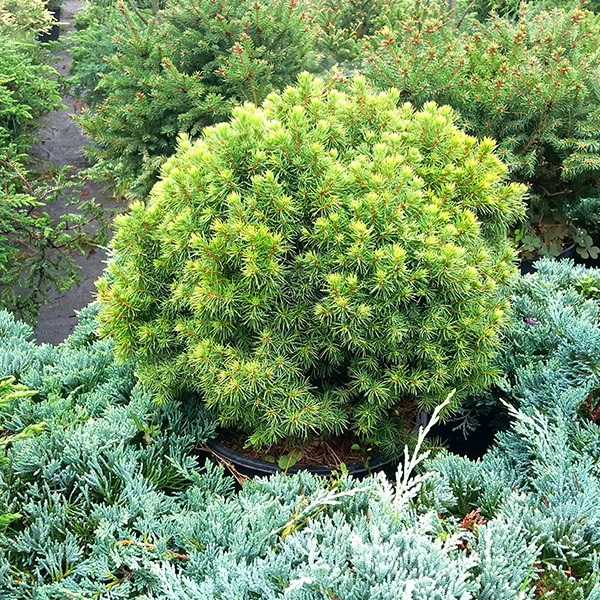 Ель Alberta Globe - Picea glauca Alberta Globe. Карликовое растение, мутация известной Picea glauca Conica, вот только форма кроны не коническая, а почти шаровидная. Растёт очень медленно. 10- ти летние растения обычно не превышают 40 см. К почвам не требовательна, не выносит пересушивание грунта, в этом случае теряет хвою. Хвоя тонкая, короткая, не колючая, расположена на веточках радиально, зелёная. Корневая система поверхностная, густо разветвляется. Рекомендуется для выращивания в групповых посадках, например, в каменистых садах. Часто поражается паутинным клещом.