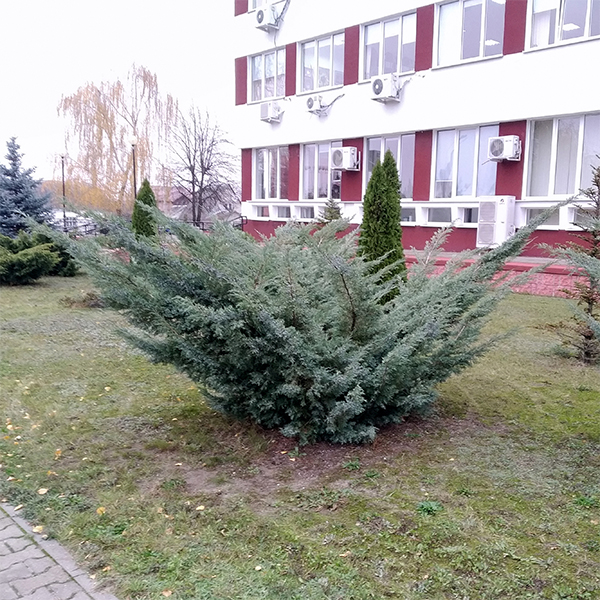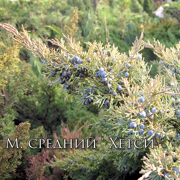 Можжевельник виргинский Hetz - Juniperus virginiana Hetz. Сорт с достаточно большой силой роста. В 10- ти летнем возрасте растение подтягивается к 1 м в высоту, а его диаметр достигает 1,5м. Этому можжевельнику свойственна раскидистая, ажурная, элегантная крона. Хвоя не колючая, чешуйчатая. Цвет серо - голубо – стальной (яркость цвета сохраняется только при посадке на солнечном месте). С наступлением морозной погоды окраска иголочек может изменяться, приобретая бурые, красновато - лиловые оттенки. Растение образует плоды – мелкие шишко ягоды синего цвета с беловатым восковым налетом. Можжевельник Хетц неприхотлив к составу грунта, легко переносит засуху на почве, но чувствительно к пересушиванию воздуха – хвоя на кончиках желтеет. Этот можжевельник исключителен как солитер или в сочетании с аналогичными по силе роста хвойными растениями на полянах или откосах.