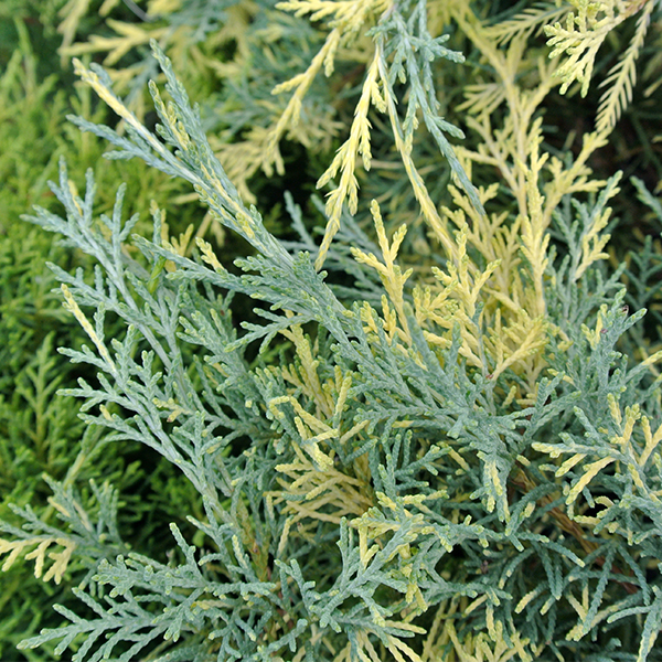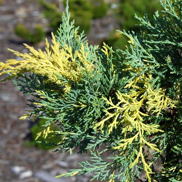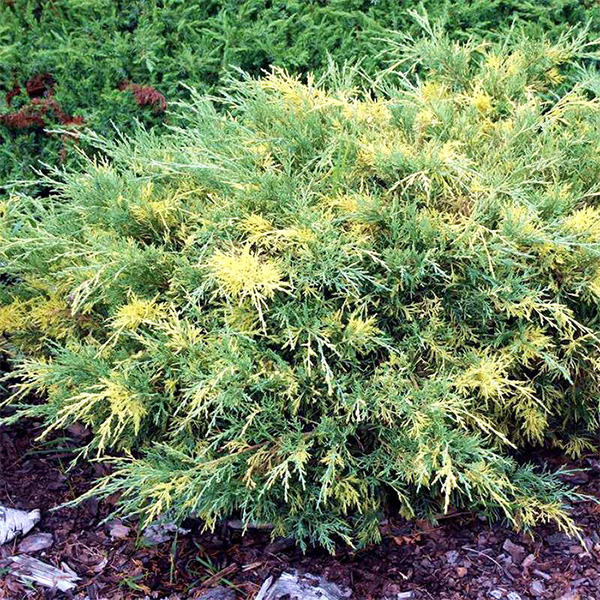 Можжевельник средний Blue and Gold - Juniperus media Blue and Gold. Хвойный кустарник с раскидистой, неправильной формой кроны. Набирает массу достаточно быстро – в 10 -ти летнем возрасте растение достигает высоты порядка 0,8 м и диаметр кроны более 1,1 м. Этот сорт примечателен пёстрой: желто - голубой хвоей. На солнечных участках хвоя более контрастна и ярче выкрашена. В тени куст теряет оригинальную расцветку и становиться рыхлым. К плодородию почвы не требователен, растет на песчаных и даже на каменистых участках; не переносит переувлажненный грунт. Как все можжевельники обладает фитонцидными свойствами.