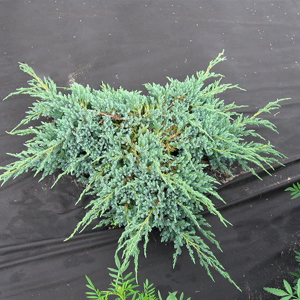 Можжевельник чешуйчатый Блю Карпет– Juniperus squamata Blue Carpet. Вечнозеленый хвойный кустарник. Характеризуется сильноветвистой кроной плоской формы. Свое название сорт получил за хвою серебристо - голубого цвета. Растение с быстрым ростом, годовые приросты могут достигать 40 см. В 10- ти летнем возрасте высота куста 40-50 см, а диаметр кроны не менее 1.5-2,0 м. Сорт совершенно нетребовательный к почве. Желательно выбирать солнечные места, без застоя воды, например, откосы в этом случае хвоя будет ярко выкрашенной.