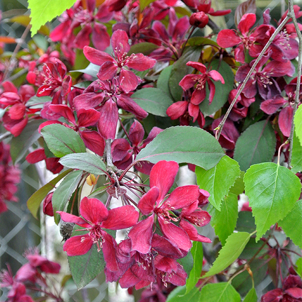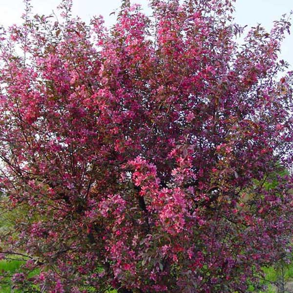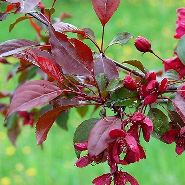 Яблоня Роялти - Malus hybride Royalty. Это дерево с медленным ростом и компактной кроной в молодости, однако со временем крона становиться широкоовальной, раскидистой. Листья глянцевые, распускаются бордово-пурпурными, летом они приобретают зеленовато-красные оттенки. К осени они становятся коричнево-красными, и это создает потрясающий контраст в саду. Ветви этой яблони тонкие, кора тёмно-бурая. Цветки крупные, их диаметр достигает 4 см, пурпурные или рубиново-красные, во время цветения их цвет очень похож на цвет листвы.