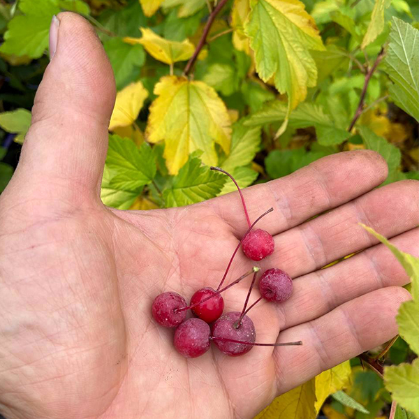 Плоды твёрдые, очень мелкие, не более 1 см, с сизым восковым налётом. Их цвет пурпурный или тёмно-бордовый. Вкус плодов вяжущий, кисло-сладкий с отчетливыми нотками горечи. Такая особенность придаст особый вкус вашим десертам или джемам.