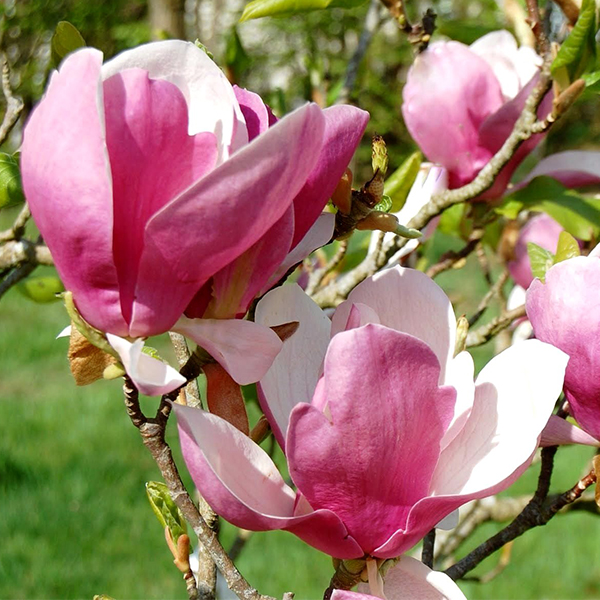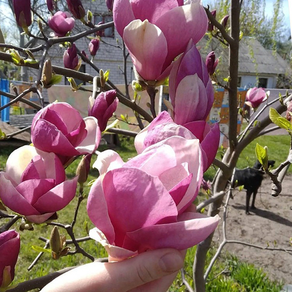 Magnolia×soulangeana Rustica Rubra - Магнолия Суланжа Rustica Rubra. Растет быстро в виде невысокого деревца с низкой кроной или как широкий кустарник. Крона низко посажена. Высота от 3 до 5 м , зависит от условий. Цветение обильное и продолжительное. Цветки крупные до 25 сантиметров, бокаловидные, округлые, снаружи окрашены в розовый цвет, внутри белые. Листва появляется после цветения. Предпочитает богатые гумусные почвы, обильный полив, особенно в жаркое время. Лучшим местом будут закрытые от ветров участки. В нашем климате для растения желательно выбирать легко тенистый ( с рассеянным светом ), защищённый участок. Растение ничем не болеет, так как не очень у нас распространено и вредителей для него пока нет. Осенью молодому растению необходимо замульчировать почву в приствольном круге. Магнолия - морозоустойчивое растение, полностью прикрывают только молодые экземпляры, но цветочные почки трогаются в рост при первом потеплении и могут быть повреждены возвратными заморозками. И вот эта проблема будет основной при выращивании магнолии. Поэтому место для посадки магнолии выбирать надо продуманно.
