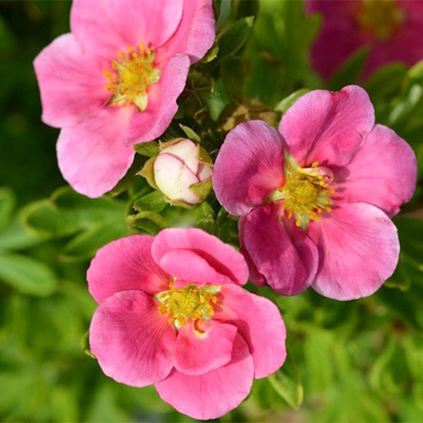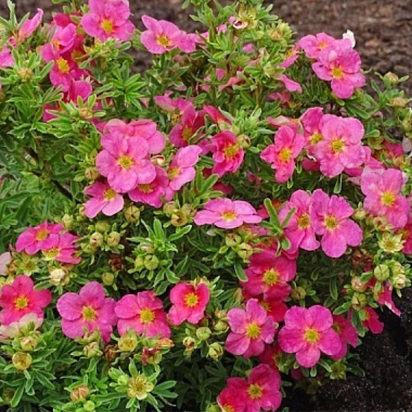 Лапчатка Bellissima - Potentilla Fruticosa Bellissima. Существенное отличие этого сорта от других в том, что это компактный невысокий кустарник высотой не более 30 см. Мелкие, светло – зелёные листья с лёгким опушением, как у большинства сортов. Цветёт так же обильно и продолжительно, как и другие лапчатки с июня до октября. Вот только цветки её не реального глубоко – розового цвета. Рекламные буклеты и каталоги утверждают , что цветки не выгорают на солнце, однако такое случается и с этим сортом. Возможно причина в недостаточном увлажнении почвы в жаркие, солнечные дни. Лапчатка сорта Bellissima любит солнечный свет. Для хорошего роста ей необходима рыхлая, плодородная, достаточно увлажненная земля. Кустарник вынослив, хорошо переносит неблагоприятные погодные условия. Сорт очень декоративен. Её идеально использовать в группах, бордюрах, альпинариях.