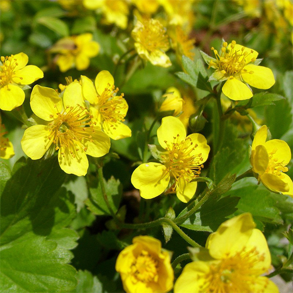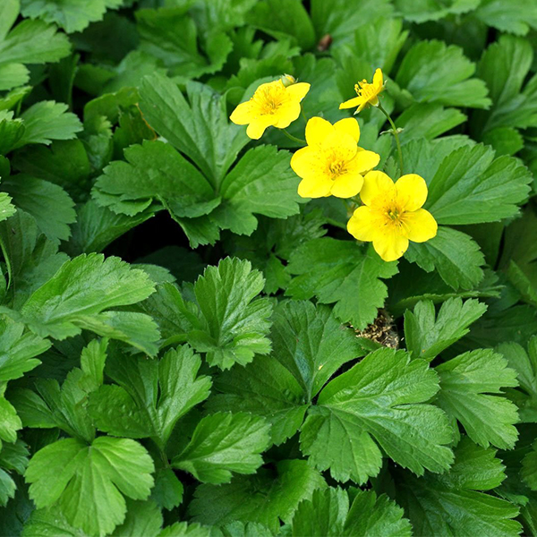 Вальдштения - Waldstenia ternata. Низкорослый стелющийся травяной многолетник, образующие густой ковер. Листья лопастные (3-5 лопастей). Растение для тенистого участка, лежачие укореняющиеся побеги образуют ковер из зимующих лопастных листьев, которые осенью желтеют. Цветки с пятью лепестками похожи на цветки лапчатки и собраны в рыхлые соцветия. Высота 10 см разрастается в ширину до 60 см, цветет в мае-июне желтыми цветками диаметром 1 см.