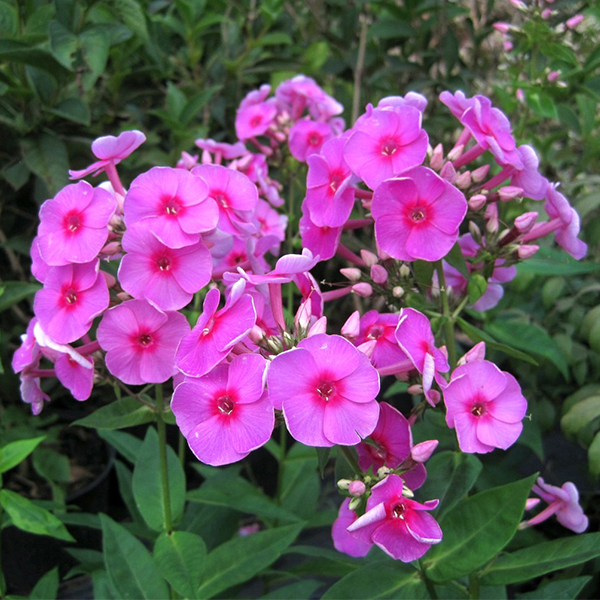 Флокс метельчатый Cosmopolitan - Phlox paniculata Cosmopolitan. Многолетнее растение образует компактный плотный куст из прочных побегов. Высота цветоносов на солнце не более 45 см, в тенистых местах вытягивается. Цветки крупные (до 4 см диаметре), насыщенно-розового цвета с ярким малиновым сердечком в центре. Соцветие плотное, шаровидное. Листья темно-зеленой окраски. Период цветения начало июля - сентябрь. Сорт устойчив к грибковым заболеваниям. Для солнечных мест с плодородной землёй.