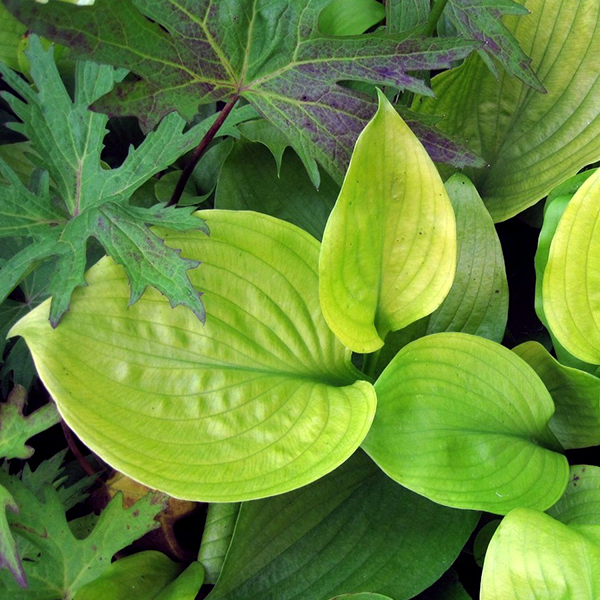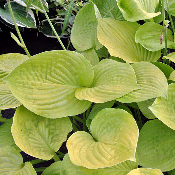 Хоста August Moon - Hosta hibrid August Moon. Листья при распускании светло - зелёные, летом становятся жёлтыми. Высота цветоноса 50 см.